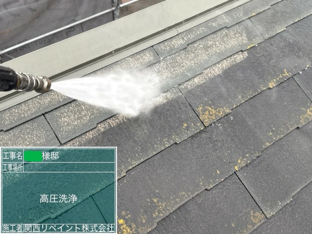 まずは屋根全体を高圧洗浄でしっかり洗い流します。